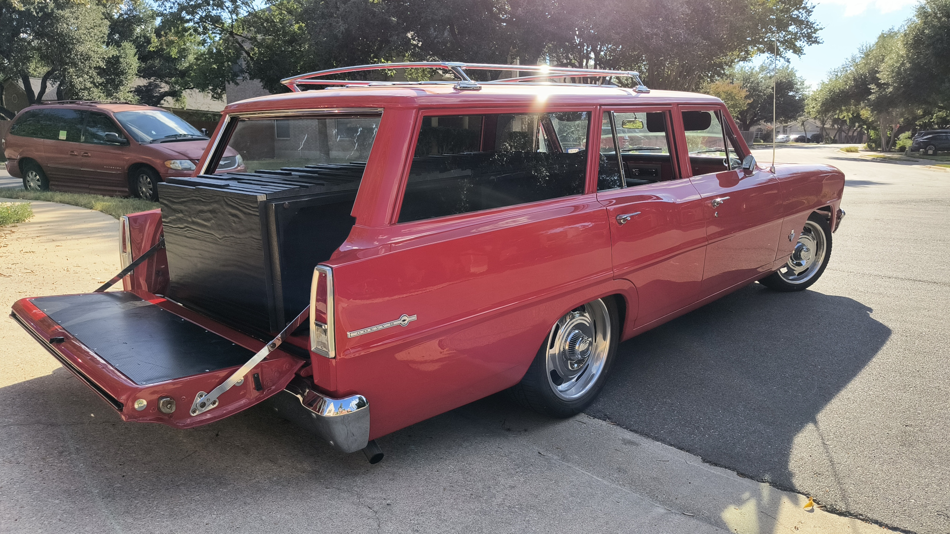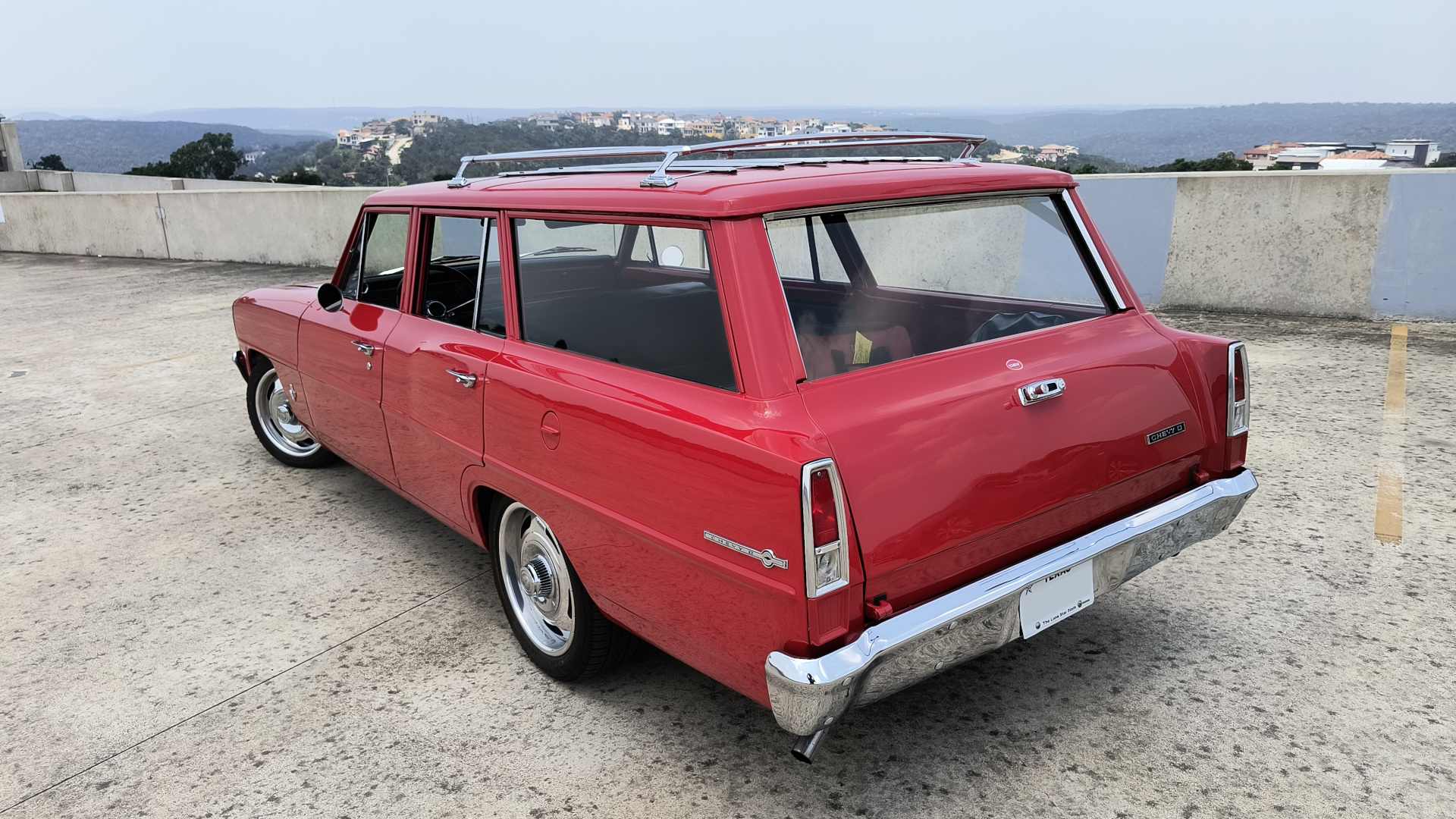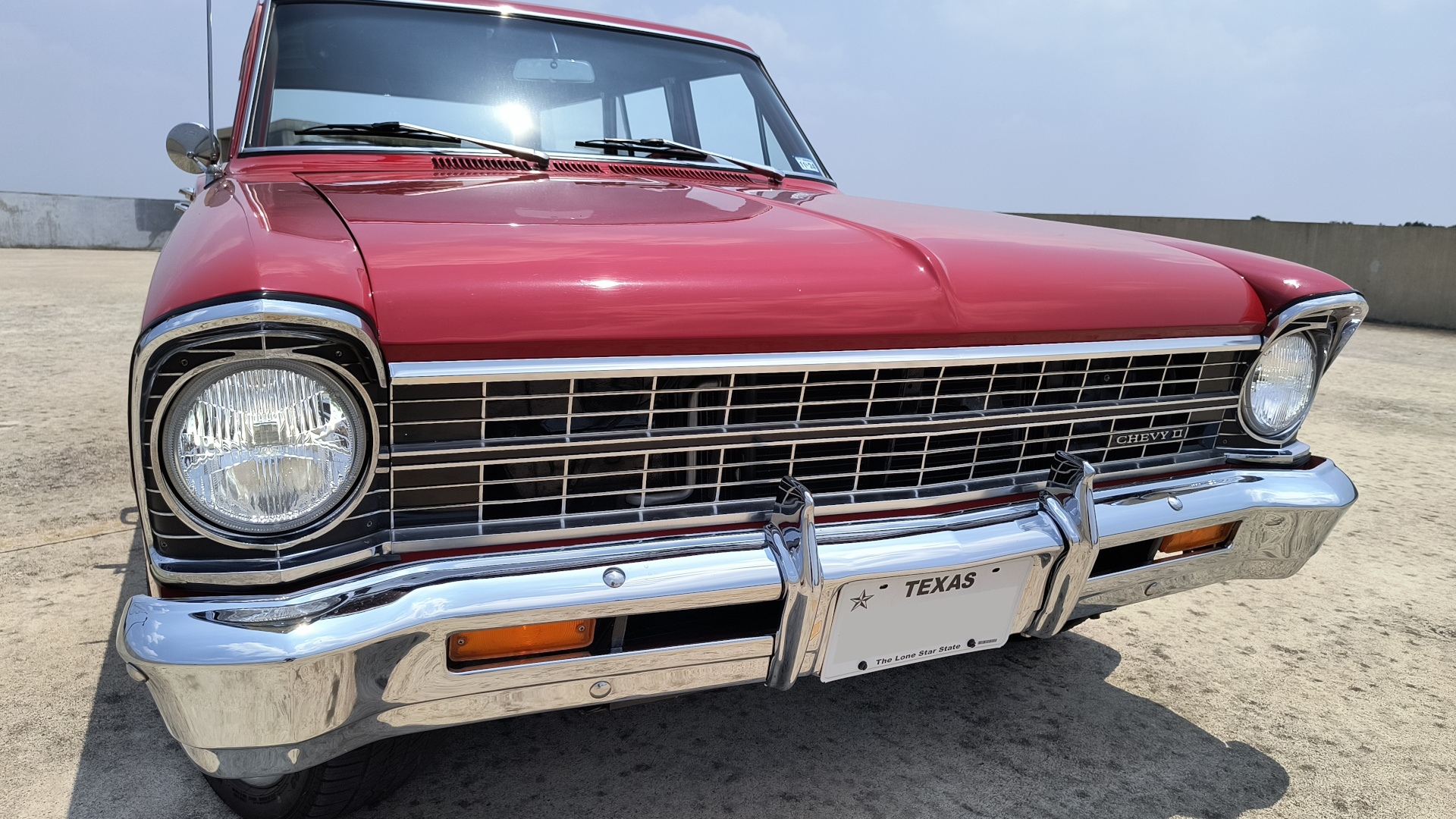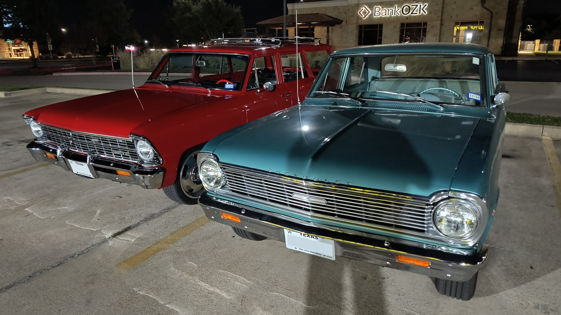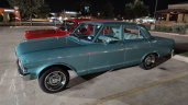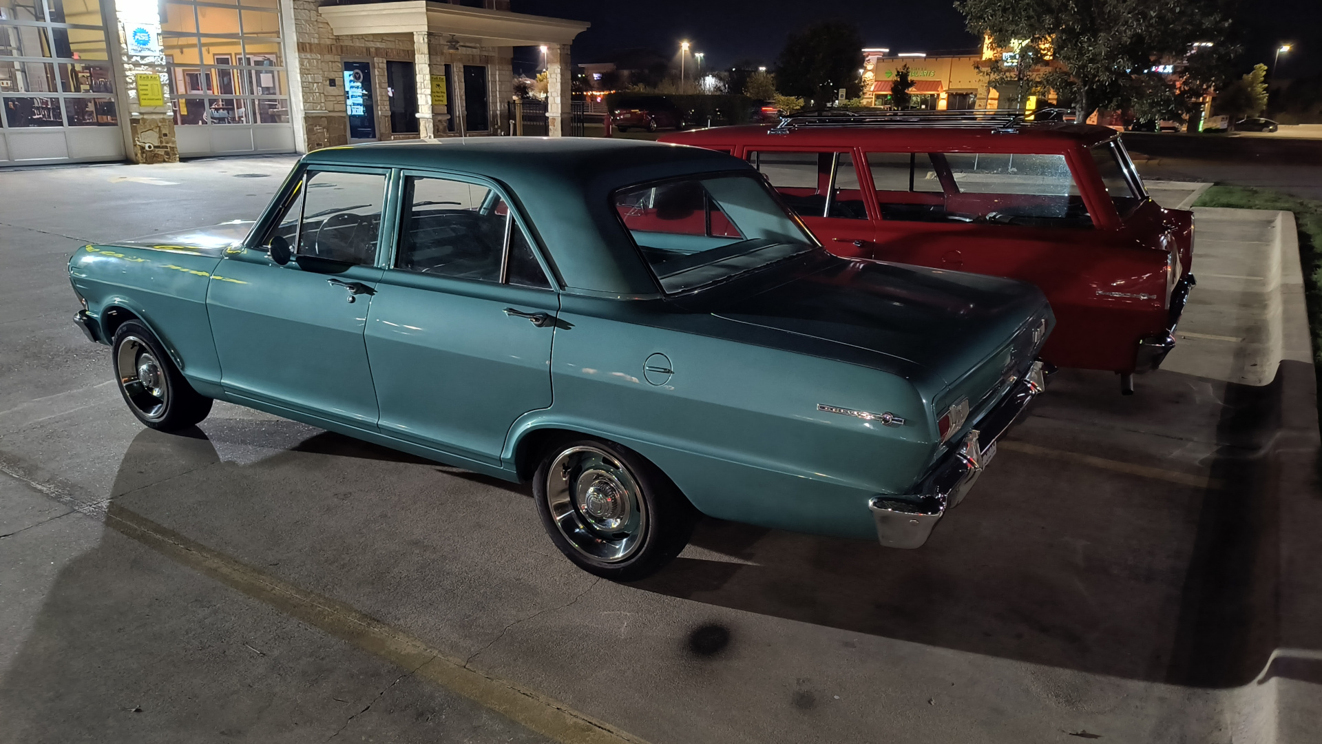 I saw this first generation (1961-1965) Chevy II sedan when I was driving the wagon one night. I never got to meet the owner — you might notice the late hour and the auto shop in the background of one of the photos. I love the interior and exterior color and it's in great cosmetic condition.