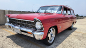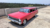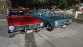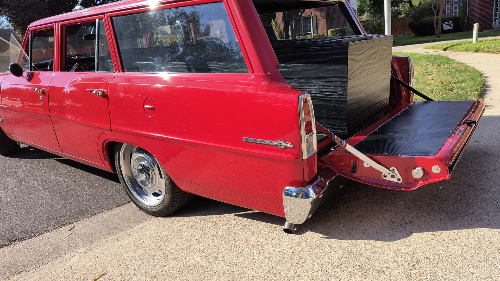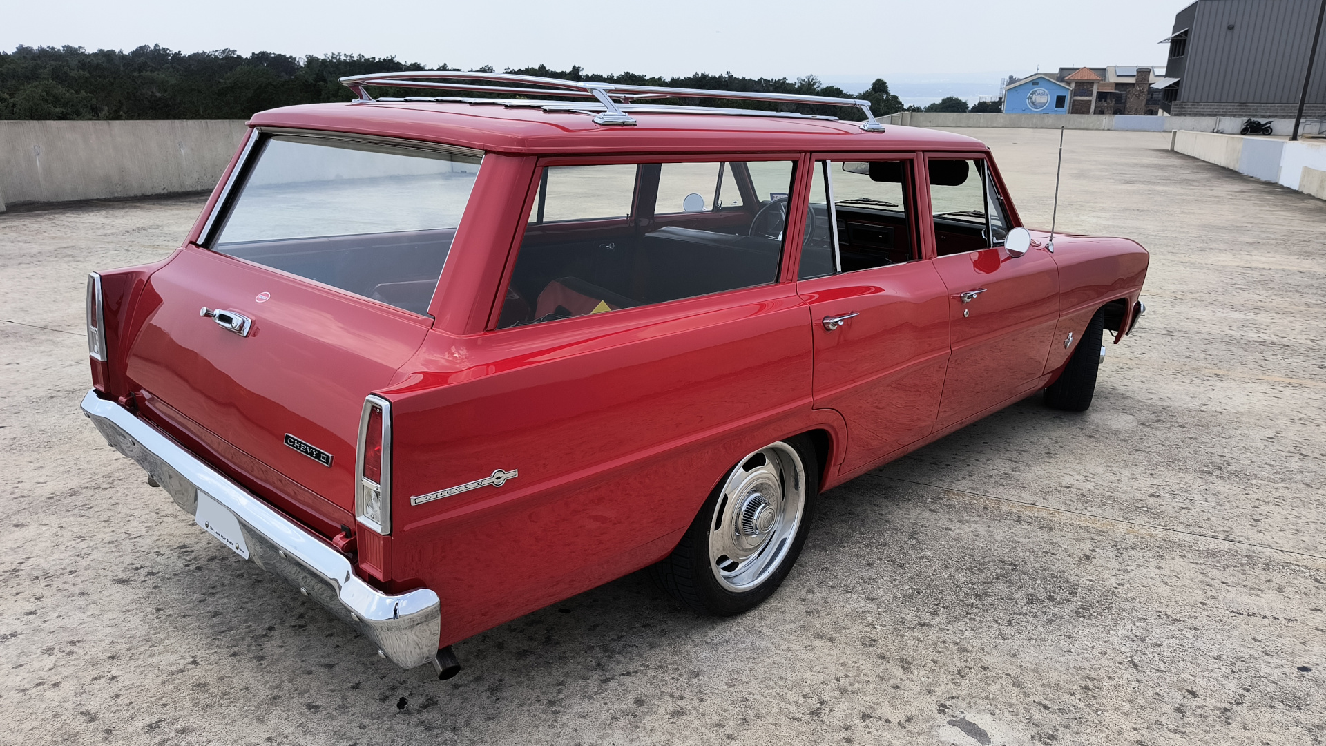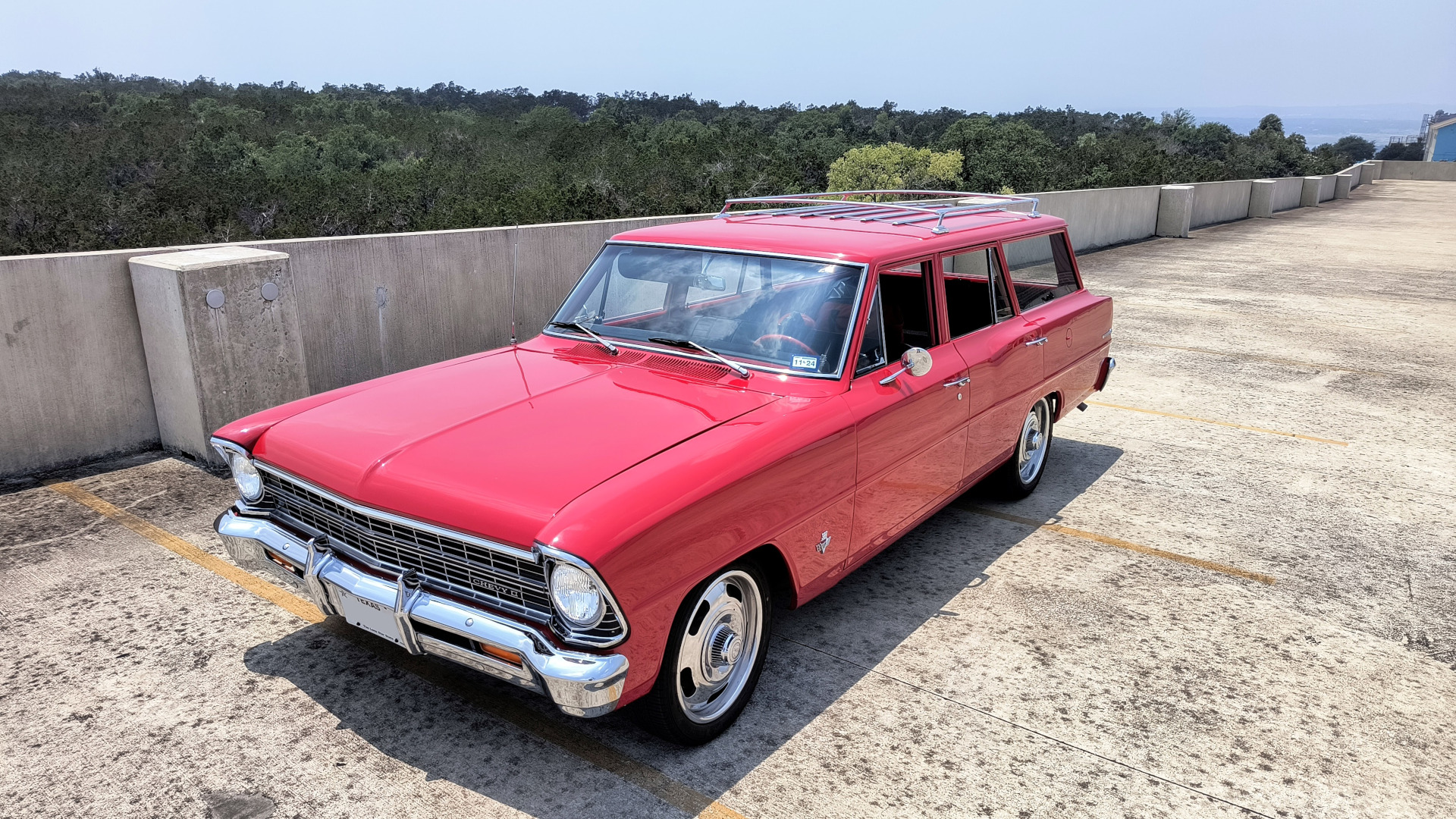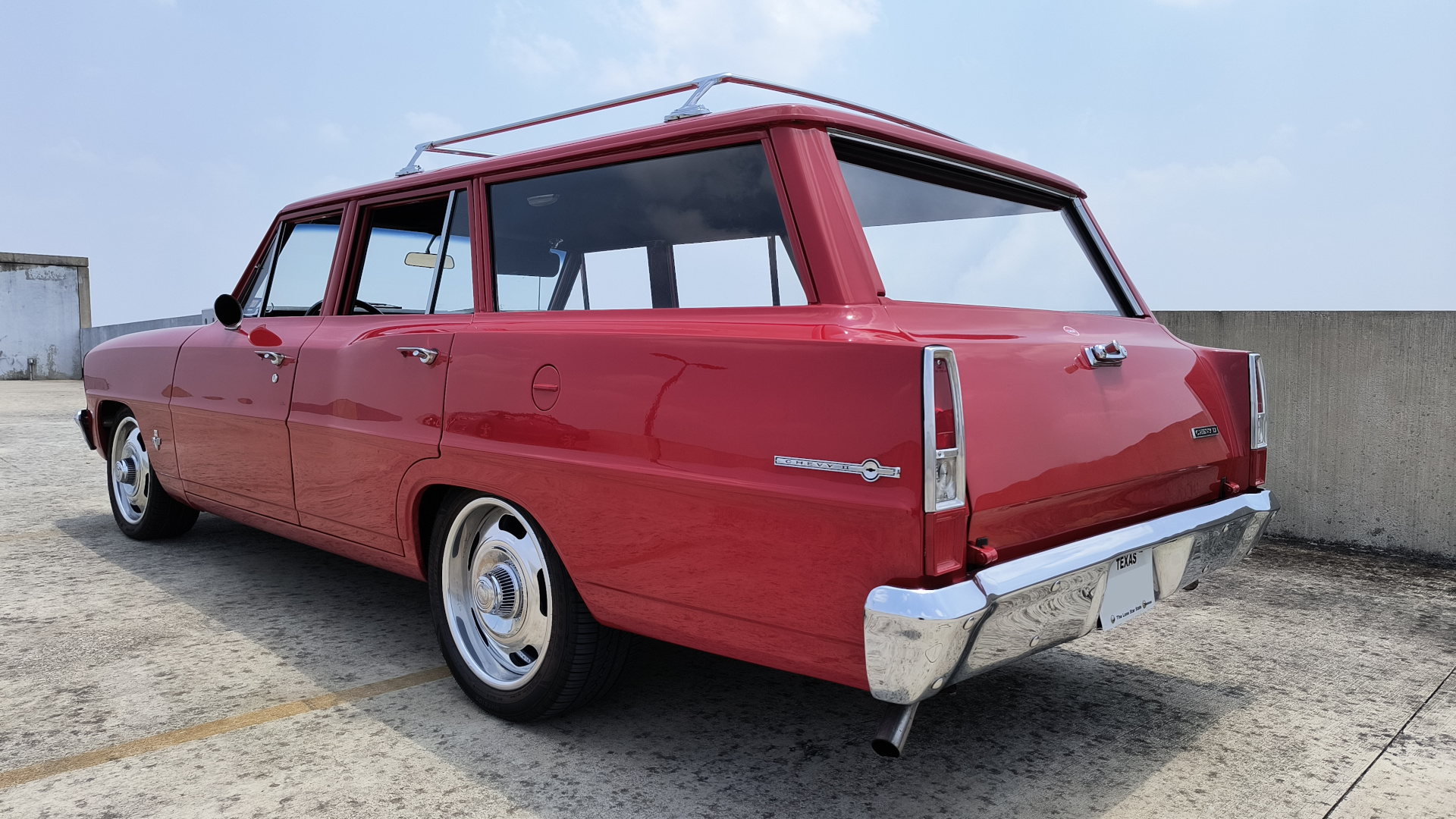 I saw this first generation (1961-1965) Chevy II sedan when I was driving the wagon one night. I never got to meet the owner — you might notice the late hour and the auto shop in the background of one of the photos. I love the interior and exterior color and it's in great cosmetic condition.