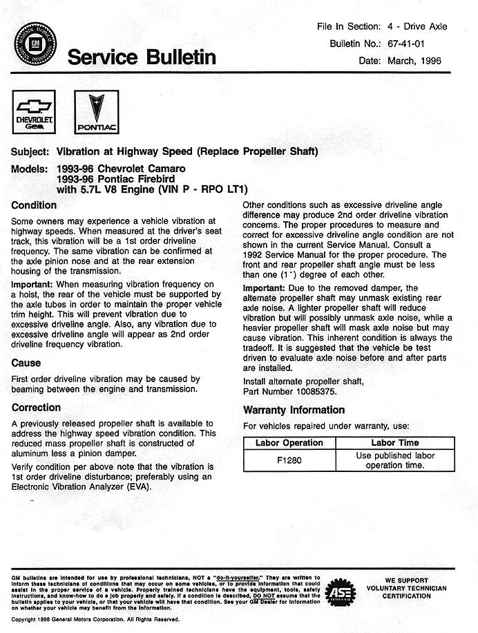 I had the infamous "vibeshaft" problem apparently common to fourth-gen F-bods. Over 80 mph the poorly-balanced steel driveshaft picks up a strong vibration. Fortunately I learned about a GM technical service bulletin through the (now defunct) F-body mailing list. I grabbed an image from a guru there (thanks, Jim!) and took it to Red McCombs Pontiac. They replaced it under warranty in two days when most folks had to wait a week or more. They also didn't give me any hassles about how you shouldn't be driving that fast and other weasely nonsense. For that I must say I was very pleased with the experience of dealing with them.