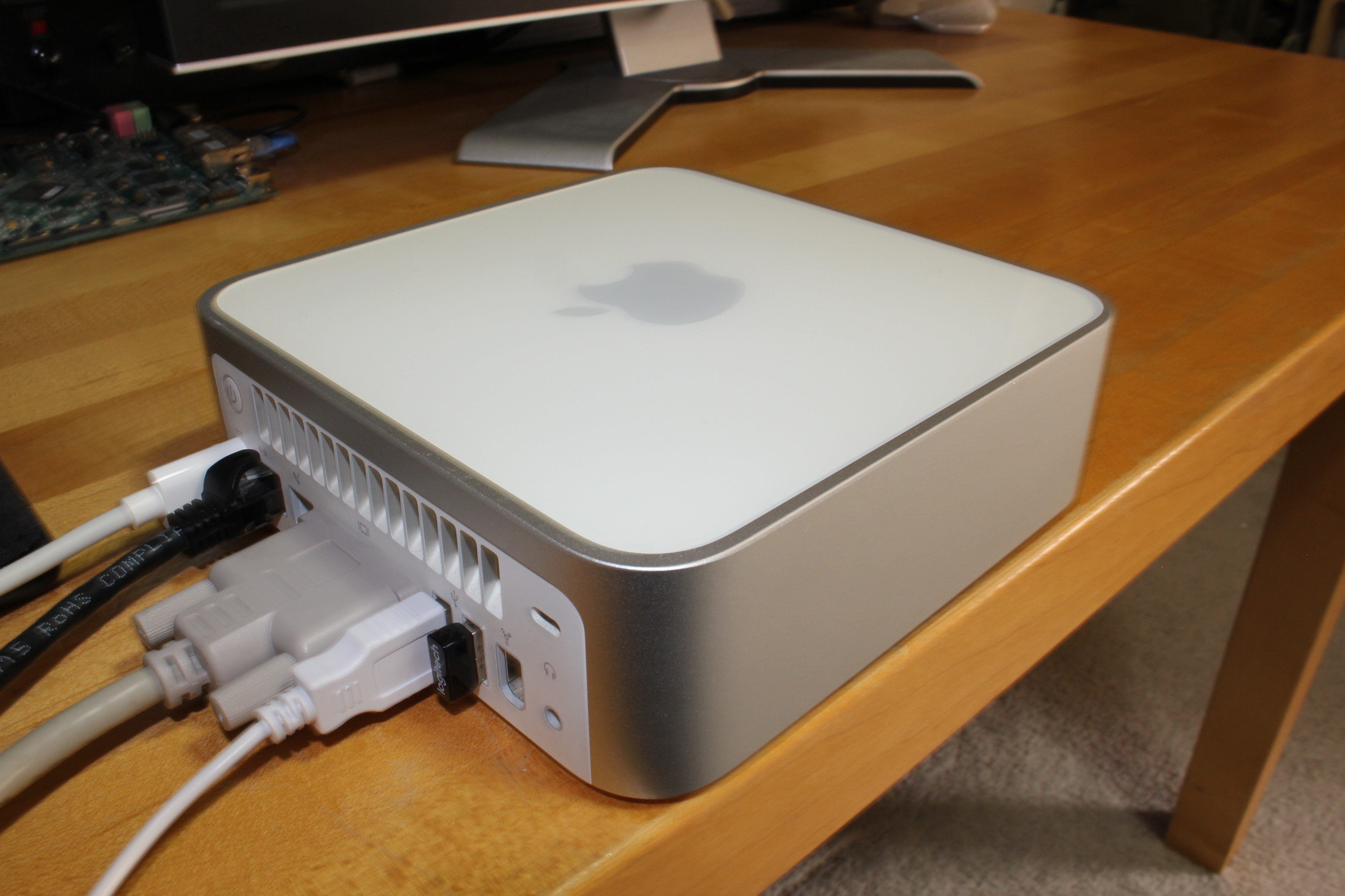 At some point I splurged on the novelty of having a computer in the kitchen for looking up (and storing) recipes, music, everyday web access, family photo slideshow when idle and, eventually, a computer for the kids to do homework. Since my wife has been an Apple fan for a long time (even before that on MC68000, two-floppy toasters) a Macintosh made sense. Apple's new Mini line made even more sense to me since, unlike the iMac, you didn't throw away an expensive monitor every time you upgraded. (We're on our third Mini in that location.) But this one was special because it ran a Motorola PowerPC 7447A, one of the "G4" (generaton 4) CPUs. Its eventual downfall was the tiny 256 MiB of RAM I bought it with and then upgraded to 512 MiB. A half GiB just wasn't enough for Mac OS X 10.4 and a few applications. However, it seems to be a fine platform for a headless Linux system.