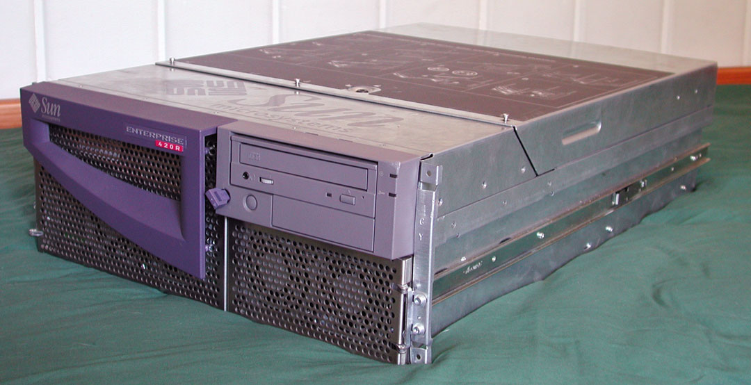 As mentioned elsewhere in the museum, I was nutty for symmetic multiprocessing before multi-core x86 made it ubiquitous. So when I found this fully loaded Enterprise 420R at auction, I knew I had to have it. All four UltraSPARC CPU slots and the full 4 GiB of RAM were populated. And as a rack-mount server, it was loud when powered.